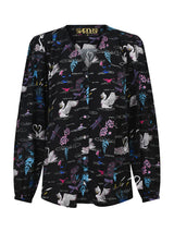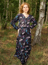 The ’Betty’ is inspired by a classic vintage design blouse; elegant, fluid and flattering. It features a V neckline, subtle puff shoulder and covered button fastening on the front. Cut from textured crepe fabric. Inspired by the River Thames, our Swan song print features dreamy purple and blue tones with florals and swan motifs. Tuck into cream or blue jeans and pair with ankle boots.