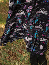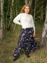 Cut from textured crepe fabric. Inspired by the River Thames, our Swan song print features dreamy purple and blue tones with florals and swan motifs. Pair with a chunky knit and ankle boots for a chic winter look. We love it paired with a white jumper as seen on the model, or pair it with pink for more of a pop!