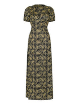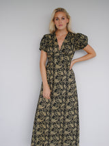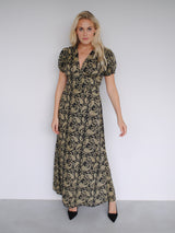 The Evelyn silhouette makes the perfect summer day dress for garden parties or days out in the city. The maxi style features a plunging V neck, A line skirt and short puff sleeves. The waist panel is detailed with vintage-style covered buttons and has a tie at the back to create a flattering cinched silhouette. Fastens with a zip at the side and has a small slit at the back.