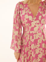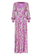 This sheer purple chiffon has satin lining and is patterned with a metallic floral design. Style with gold heels and jewellery for a striking event outfit!