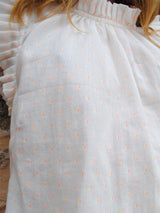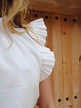 This lightweight white cotton features yellow and orange neon dots. This versatile style looks stunning paired with denim cutoffs or breezy white linen in the summertime.