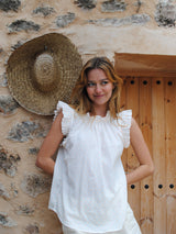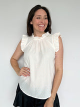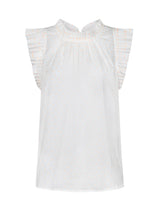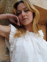 Embrace flirty femininity with the sleeveless ‘Victoria Sun Blouse'. With a loose, breezy silhouette enhanced by voluminous ruffles gathering along the shoulders and high neckline. Features a button closure on the back of the neck.