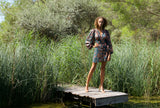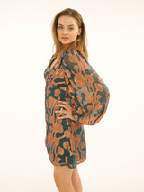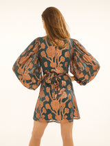 Channel a 70s inspired glam spirit with the ‘Diva’ mini dress. The flattering cinched silhouette features a plunging V neck, A line skirt and waist panel with an adjustable tie at the back. Detailed with vintage-style covered buttons and oversized balloon sleeves with elasticated cuffs.