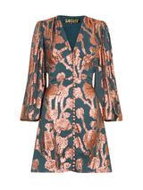 This sheer emerald chiffon is satin lined and adorned with bronze metallic flowers. Pair with heels and fine gold jewellery for a fun festive party look.