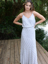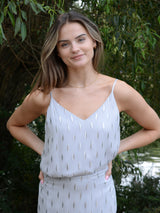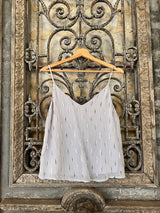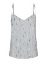 The V Cami is a simple V neck camisole - elegant, fluid and a perfect layering addition to your wardrobe. With a relaxed fit and adjustable spaghetti straps. In a lovely grey chiffon, decorated with silver and gold metallic flecks. Satin lined. Pairs perfectly with the matching Flora skirt or easily style with jeans.