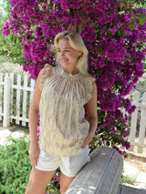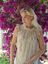 Embrace flirty femininity with the sleeveless ‘Victoria Sun Blouse'. With a loose, breezy silhouette enhanced by voluminous ruffles gathering along the shoulders and high neckline. Features a button closure on the back of the neck.
