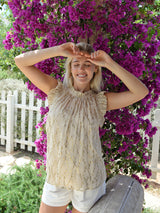 This cream chiffon is decorated with a gold spot print. This versatile style looks stunning paired with denim cutoffs or breezy white linen in the summertime.