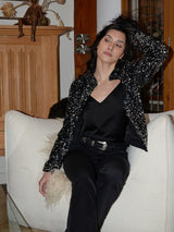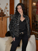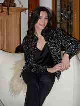 The 'Stella' jacket is a contemporary take on an Indian inspired silhouette. With a classic straight fit, this piece is timeless and versatile. This sparkling black sequin fabric makes this a perfect festive party piece! Style with jeans and a camisole for a chic elevated night out look.