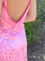 Our fun and feminine maxi dress is adorned with a stunning butterfly embroidery and cutwork detailing. In vibrant pink with darker stitching, this is sure to be a showstopper of your summer wardrobe! With adjustable spaghetti straps and a low V shaped back. The perfect sexy slip dress to throw on for holiday nights out or summertime dates!