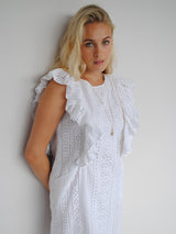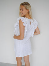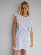 Claudia is our fun spin on a classic Shift dress. This mini dress style has voluminous frills lining the torso and the back, with a pop of gold piping to frame them. With convenient front pockets and a keyhole closure on the back. Cut from thick white cotton with intricate broderie anglaise cutouts, lined underneath.