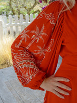 Cut from vibrant red soft crinkle fabric. The star of the show is the striking cutwork and embroidery on the balloon sleeves. Pair with gold sandals and fine gold jewellery for a chic summer outfit.