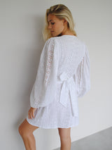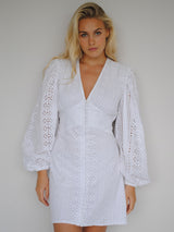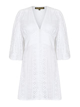 Cut from white broderie anglaise patterned fabric, with lining under the body. Pair with gold sandals and fine gold jewellery for a chic summer event outfit.