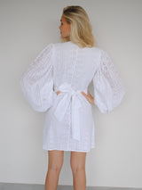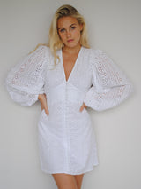 Channel a 70s inspired glam spirit with the ‘Diva’ mini dress. The flattering cinched silhouette features a plunging V neck, A line skirt and waist panel with an adjustable tie at the back. Detailed with vintage-style covered buttons and oversized balloon sleeves with elasticated cuffs.