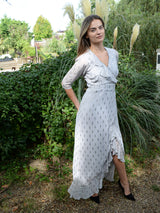 This light grey chiffon is decorated with silver metallic flecks. Style with silver heels for a beautiful event outfit.