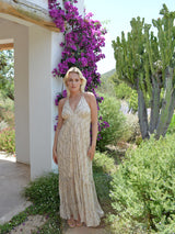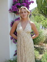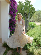 Hanky is the perfect summer holiday style! This halterneck style ties at the back of the neck, with tassel tie details. The bust can be gathered for a fit tailored to your body, and ties across the open back. The voluminous skirt has ruffle details on the tiers.