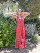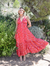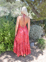 Hanky is the perfect summer holiday style! This halterneck style ties at the back of the neck, with tassel tie details. The bust can be gathered for a fit tailored to your body, and ties across the open back. The voluminous skirt has ruffle details on the tiers.