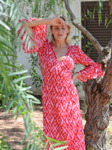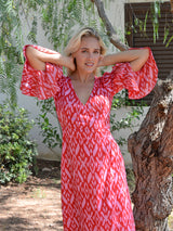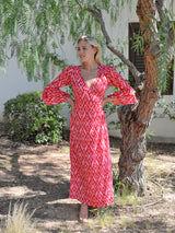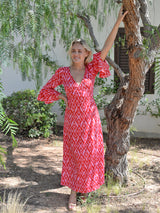 Bring a touch of playful femininity to your wardrobe with the 'Joni' maxi dress. This wrap dress is elegant, fluid and designed to flatter the curves. With a full length A line skirt, three quarter length sleeves trimmed with voluminous ruffles and a V neck to highlight your décolletage.