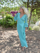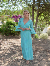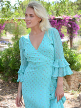 Bring a touch of playful femininity to your wardrobe with the 'Joni' maxi dress. This wrap dress is elegant, fluid and designed to flatter the curves. With a full length A line skirt, three quarter length sleeves trimmed with voluminous ruffles and a V neck to highlight your décolletage.