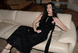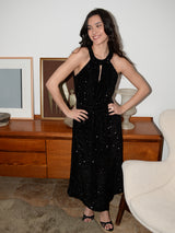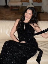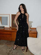 The Liz maxi dress is a classic halter neck style, elegant and classy. Our sparkling black sequin fabric elevates this look to be the perfect party outfit! Features a tie at the waist and neckline closes with a button and keyhole detail.