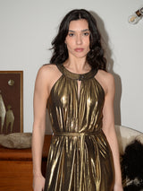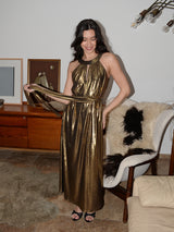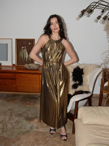 The Liz maxi dress is the perfect addition to your festive wardrobe. This stunning gold fabric is lined drapes elegantly over your figure. With a halter neck style, closing with a button and a keyhole detail on the front. Features a waist tie which can be fastened at the front or the back to cinch in your waist.