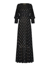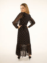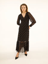 The 'Prairie' maxi dress is a sophisticated slim fitting style cut from sheer black chiffon adorned with silver metallic flecks. The V neck leads into a waist panel with a tie at the back to cinch in your figure. With a subtle frill on the shoulders and elasticated detail halfway down the arm, creating a chic mid arm drape effect. The slim A line skirt has a gathered hem.