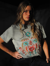 The Meadow T-shirt is an elevated take on the casual t-shirt. Cut from light cotton and adorned on the front with beautiful, intricate floral embroidery in colourful shades with a pop of neon! This piece is sure to be a staple of your wardrobe year round. Keep it casual with denim and boots or dress it up with leather trousers.