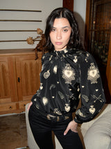 The long sleeved Victoria blouse is a perfect day-to-night addition to your autumn wardrobe. This silky lightweight fabric is adorned with cream sacred heart patterns. With a lovely ruffled neck detail.