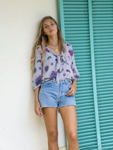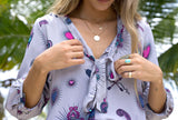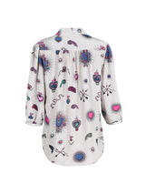 The ’Candy’ style is an elegant tie-neck blouse; shaped to drape loosely over your figure. Our twist on the style has a low v-neck tie and three quarter length sleeves. The warm blue and pink tones of the ornate and unique sacred heart pattern stand out stunningly against the cool grey backdrop.