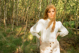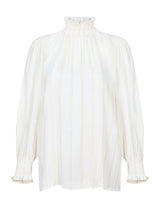 The Christine blouse is a romantic long sleeved shape. With a smocked collar as well as its cuffs, creating a pretty volume that is feminine and sophisticated. Cut from textured crepe fabric and with a metallic gold thread stripe.