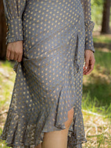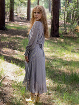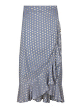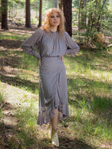The ’Mia’ design is a classic wrap style midi skirt- elegant, fluid and designed to flatter the curves. Features a tie around the fitted waist and a voluminous feminine frill along the hemline. This piece adds a touch of sparkle to casual looks, pair with a graphic slogan tee and ankle boots. Dress it up with the matching Betty blouse or Victoria long sleeve blouse (as seen on the model) for a glam look.
