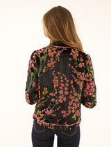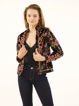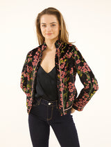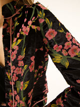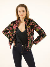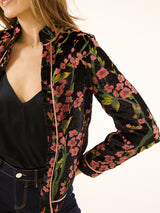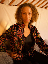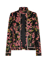 The 'Stella' jacket, cut from supple velvet, is a contemporary take on an Indian inspired silhouette. With a classic straight fit, this piece is timeless and versatile. This soft crushed velvet is adorned with a beautiful floral blossom design in pale pink and green velvet, with pale pink piping detail.