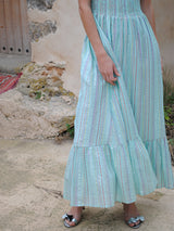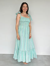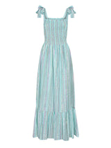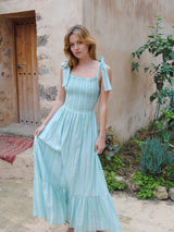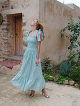 Clary is a breezy maxi dress, perfect to throw on for sunny summer days. The stretchy smocked bust gives a comfortable and secure fit. Features adjustable bow shoulder ties and a voluminous skirt with lots of movement, that falls to a frilled tier.