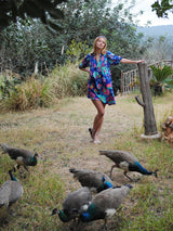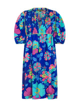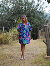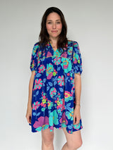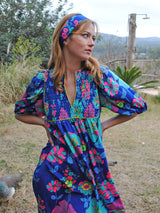 Riley is a loose fitting Indian inspired knee length dress. The straight silhouette has a quilted panel along the shoulders and bust, framed with neon yellow piping. With elbow length puff sleeves. Cut from silky lightweight fabric with a vibrant retro flower pattern.
