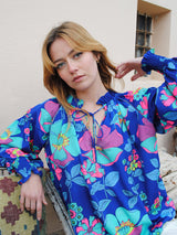 This 70s inspired floral print features vibrant colours and neons. The super lightweight fabric is perfect for easy everyday wear with blue denim.