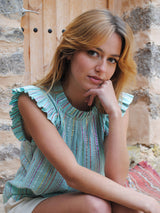 Embrace flirty femininity with the sleeveless ‘Victoria Sun Blouse'. With a loose, breezy silhouette enhanced by voluminous ruffles gathering along the shoulders and high neckline. Features a button closure on the back of the neck.