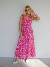 Clary is a breezy maxi dress, perfect to throw on for sunny summer days. The stretchy smocked bust gives a comfortable and secure fit. Features adjustable bow shoulder ties and a voluminous skirt with lots of movement, that falls to a frilled tier.