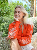 The 'Georgia' top is an effortless bohemian style piece, perfect to add to your summer wardrobe. With striking cutwork embroidery on the balloon sleeves. Cut in a vibrant red, soft crinkle fabric.