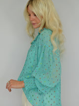 This dreamy teal chiffon is decorated with metallic rainbow spots. Style with light blue denim or white linen for a stunning summer look. This sheer style comes with a satin camisole to be worn underneath.