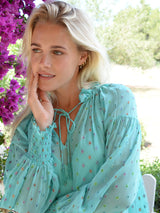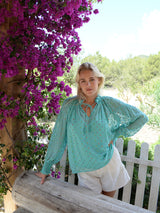 The 'Georgia' top is an effortless bohemian style piece, perfect to add to your summer wardrobe. The V neck fastens with beaded tassel ties. The balloon sleeves are finished with a comfortable shirred cuff. With a loose, relaxed silhouette perfect to tuck in to trousers.