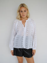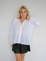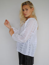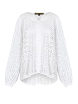 This thick white cotton features intricate broderie anglaise cutwork for a light summer feel. Tuck into slim fit or tapered trousers and pair with trainers or formal flats.