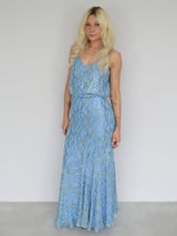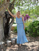 The V Cami is a simple V neck camisole - elegant, fluid and a perfect layering addition to your wardrobe. With a relaxed fit and adjustable spaghetti straps. In a beautiful blue chiffon, decorated with a gold spot pattern. Satin lined. Pairs perfectly with the matching Flora skirt or white linen.