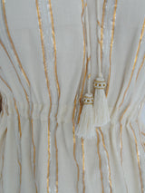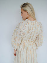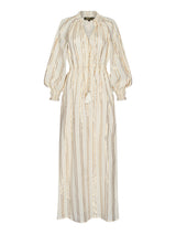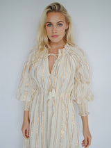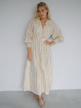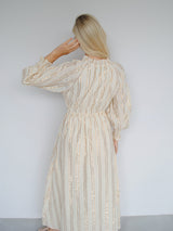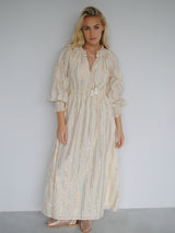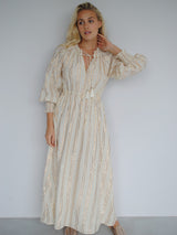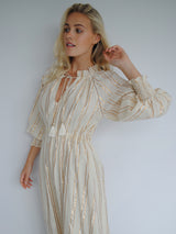 'Georgia' is an effortless and easy to wear addition to your summer wardrobe. The maxi length dress features a V neck with a tassel tie detail and balloon sleeves with a shirred cuff. Features a slim torso coming in at the elasticated waist, and flaring out into a long A line skirt. Our cotton fabric is decorated with gold and silver stripes.